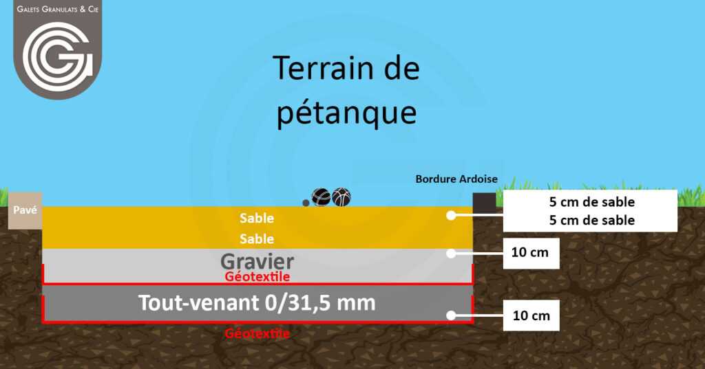 L’épaisseur idéale de sable dépend de la qualité du support en dessous. En général, on prévoit 5 cm de sable stabilisé en couche intermédiaire et 3 à 5 cm de sable de finition (sable de marbre ou dolomie). Cette dernière couche doit être parfaitement nivelée, compactée et légèrement humidifiée pour offrir un roulement optimal des boules.